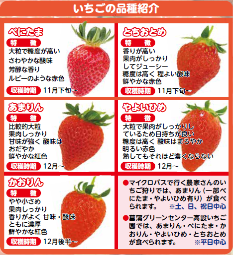 開催場所は、グリーンセンター隣接の水耕園とバスで行く農家さんでのいちご狩りとなります。