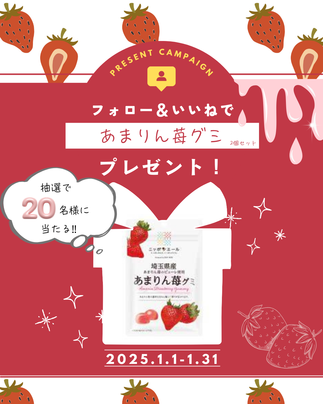 Instagramにて、埼玉県産「あまりん苺グミ」2個セットが抽選で当たるキャンペーンを開催🍓✨