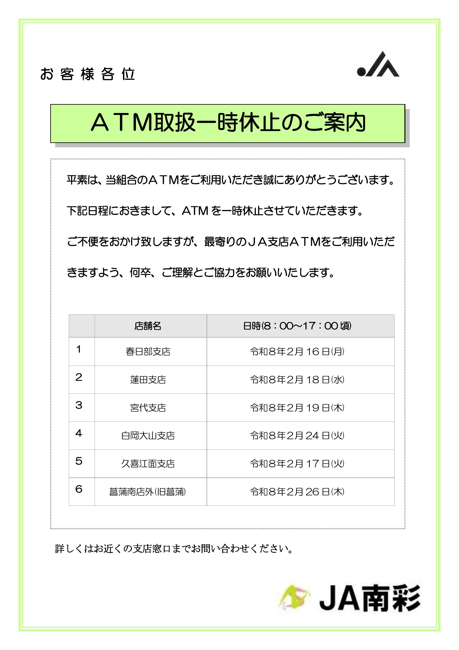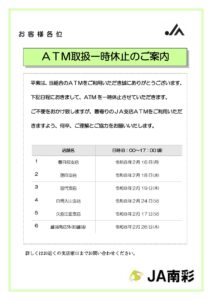 南彩NEWS 2026年1月16日お知らせ重要NEWSJAバンク ⚠️ATM取扱一時休止のご案内 いつも当組合をご利用いただき、誠にありがとうございます。下記日程において、ATMのサービスを一時休止いたします 何卒、ご理解とご協力をお願いいたします。 投稿ナビゲーション 短期プライムレートの改定について