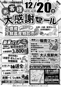 久喜キラリお客様感謝セールチラシ 12/20(土)朝9:00から毎年恒例の大感謝セールを開催します! 内容としまして…