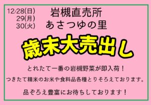 毎年、岩槻直売所では年末に向けて食料品の販売と岩槻産の野菜・果物を豊富に販売させていただいております。 今年最後のお買…